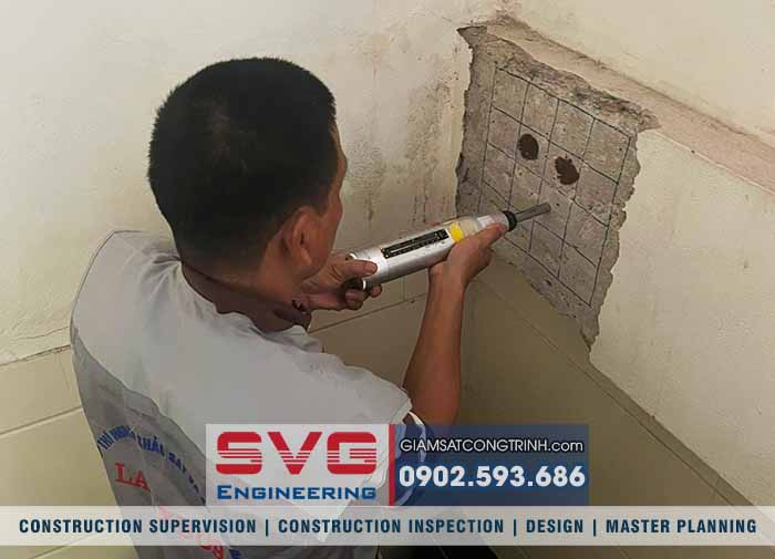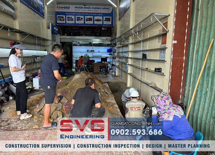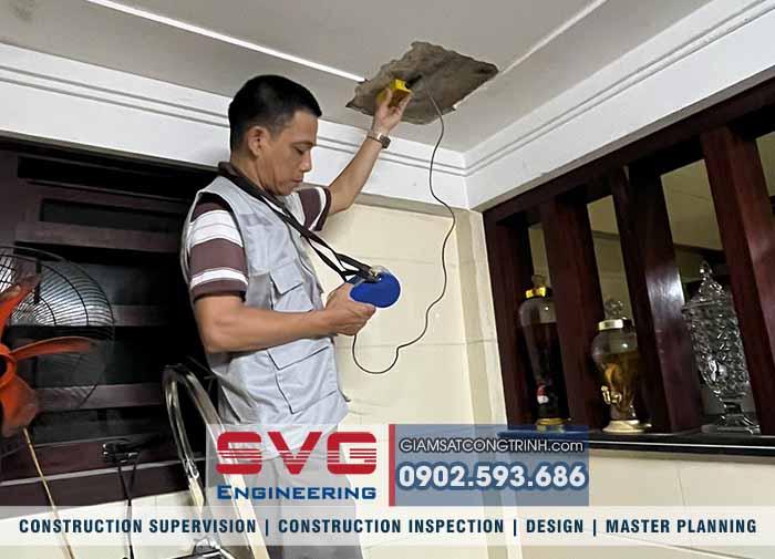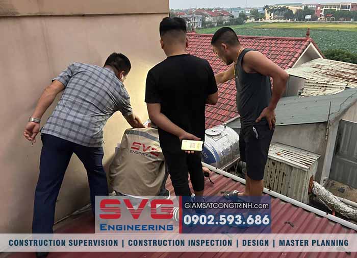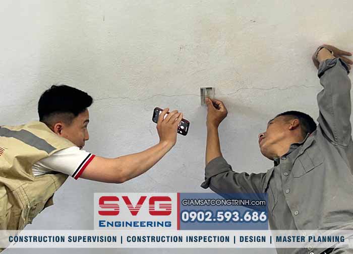 - Immediately after signing the contract, we SVG Engineering collected information provided by the homeowner, Mr. Nguyen Minh Thong, such as: Structural information of the house; Documents and related drawings. The SVG Engineering construction engineering team quickly conducted a visual survey of the cracked house and used equipment such as steel rulers, calipers, surveying machines, crack gauges, geological drills, ultrasonic rebar machines, concrete guns, etc.