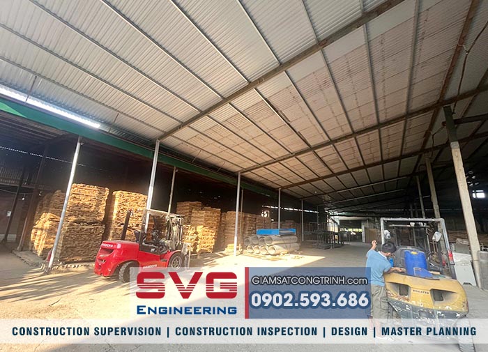 - The raw material storage area has a structure of steel columns and trusses, covered with corrugated iron roof.